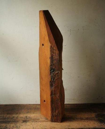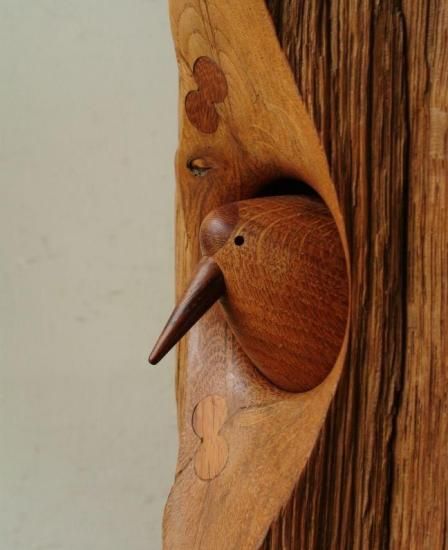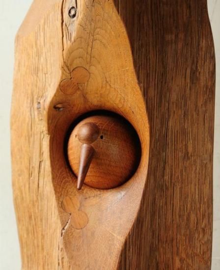 解体家屋の古材を使用し、巣穴から顔を出したクマゲラを表現しております。