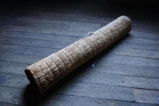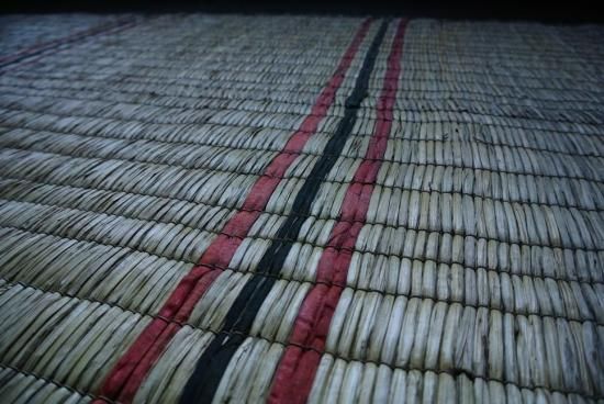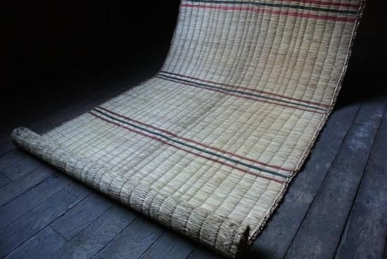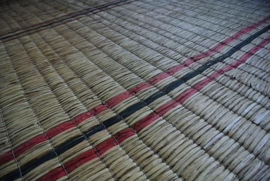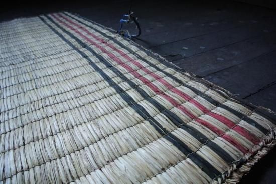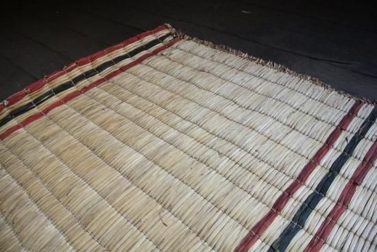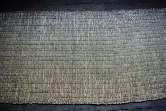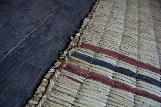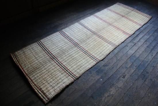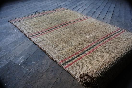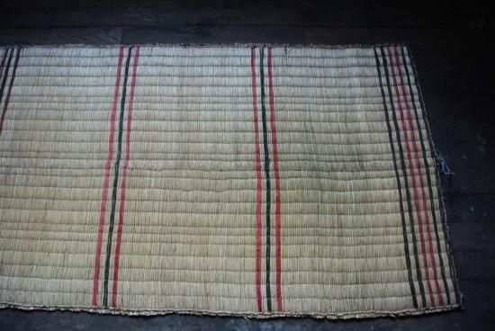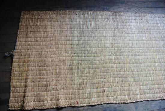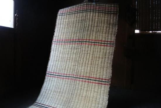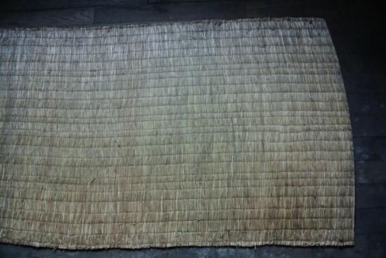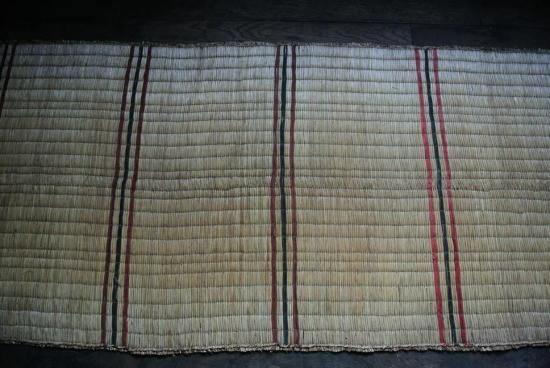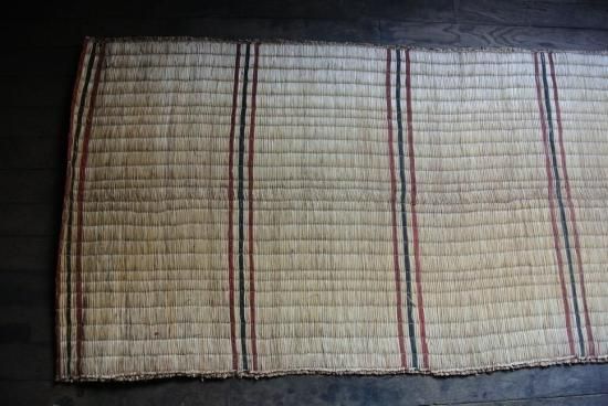 材料はガマを使用し、染めた木の皮を編み込んで文様を制作した古いものです。