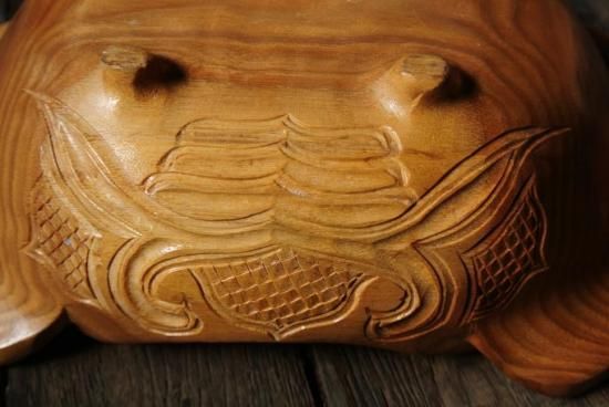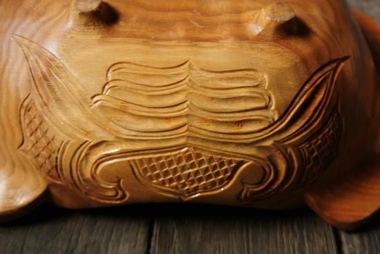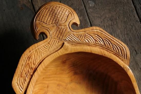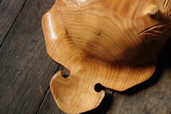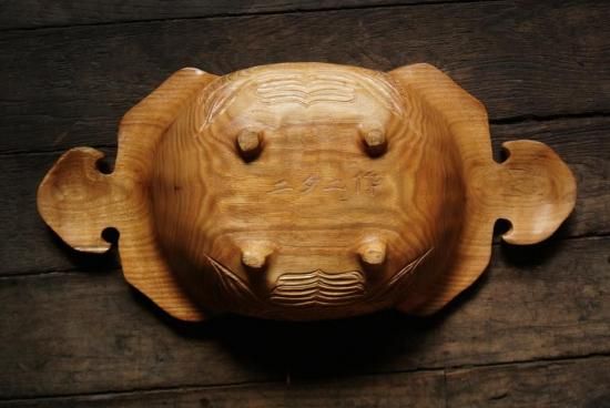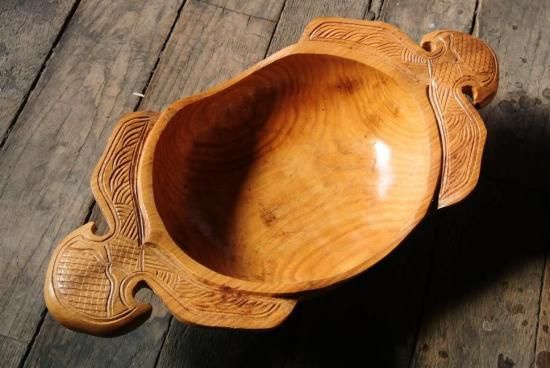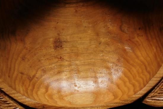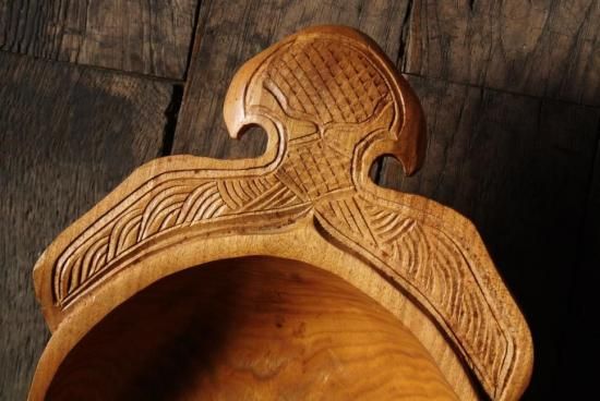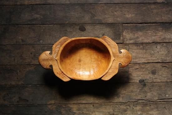 胡桃の木を刳り貫き、両端の耳にアイヌ文様を施した深鉢となっております。