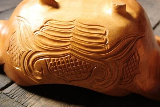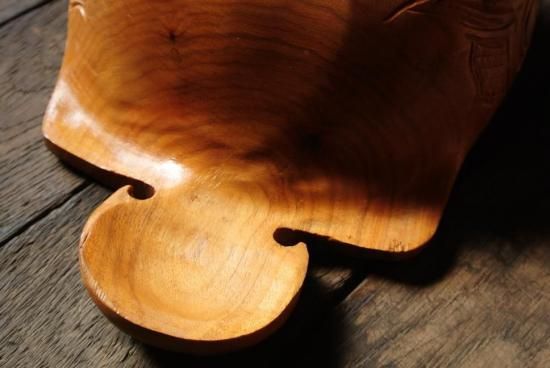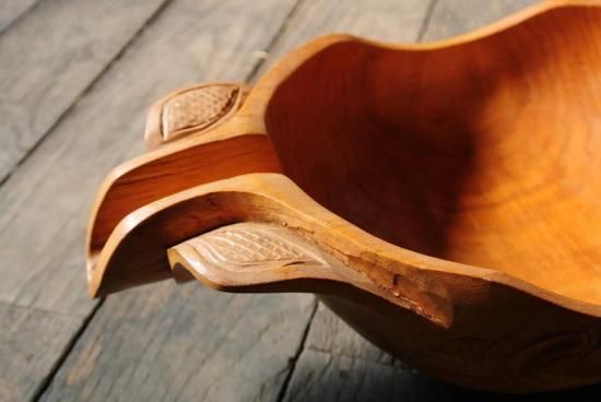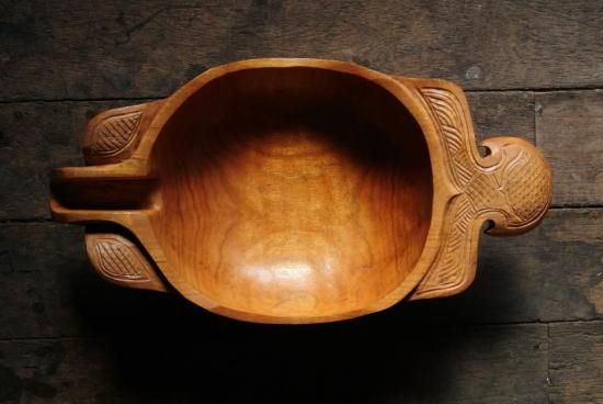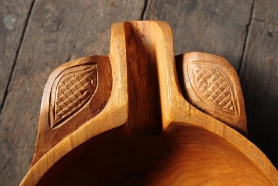 胡桃の木を刳り貫き、注ぎ口とアイヌ文様を施した片口鉢となっております。