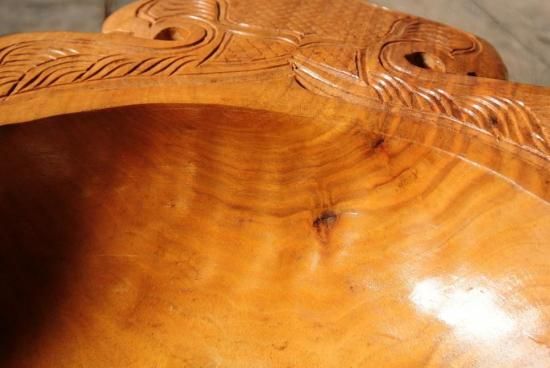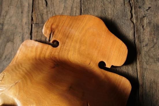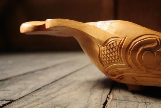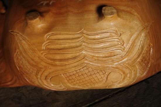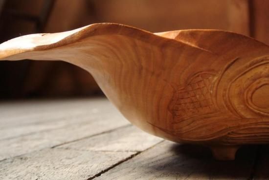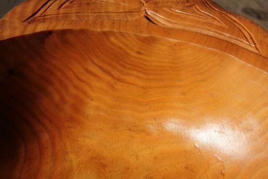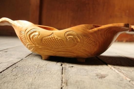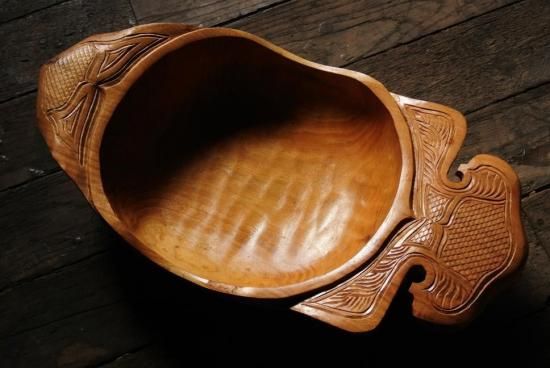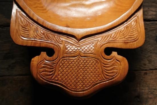 胡桃の木を刳り貫き、両端の耳にアイヌ文様を施した深鉢となっております。